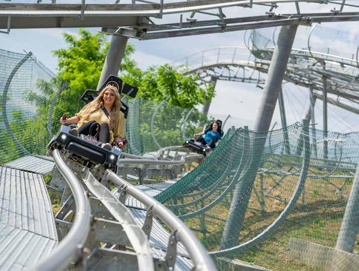 For thrills and mountain fun, SkyLand Ranch offers Sevierville’s only mountaintop attraction. Families can ride the Southeast’s longest mountain coaster, soar from the WagonWheeler swing tower, or enjoy live entertainment in a Wild West-themed setting. On-site dining, miniature farm animals, and the Horizon Skyride chairlift provide moments CONTINUED >