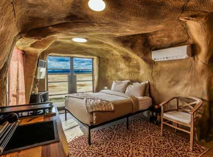 The accommodations themselves feel like outposts from another realm. Guests can choose from several unique unit types, each designed to make the stay feel like part of the adventure. The original Cave Suites offer a cozy, futuristic atmosphere with sculpted interiors that feel both grounded and imaginative. Geodesic Domes invite guests to sleep beneath the stars while still enjoying modern comfort,