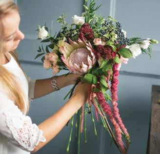 Step 2: Now it’s arranging time — think focal and filler. The best way to start the arranging process is by choosing your most interesting or favorite flowers — this will be your focal point. Hold the focal flower(s) upright and add your supporting blooms around it. Make sure to turn the bouquet as you build so that the design is as desired. Once this is complete, add your filler flowers to finalize the look. Filler options include baby’s breath, ivy, fern, eucalyptus and more.