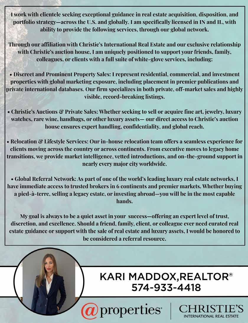 In today’s dynamic real estate market, success is no longer defined by square footage or price point alone—it’s about alignment, intention, and lifestyle. Few understand this better than Kari Maddox, a trusted real estate advisor with @properties Christie’s International Real Estate, whose expertise spans both Chicago and Northwest Indiana. With a client-first philosophy and a deep understanding of cross-market dynamics, Kari helps buyers, sellers, and investors make informed decisions that truly support how they live.