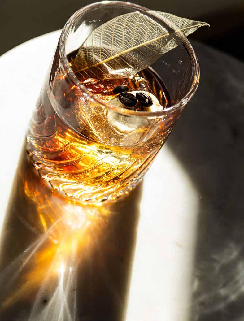 Pour all the ingredients into a mixing glass filled with ice. Stir for 30 seconds with a bar spoon. Strain over a large ice cube in a rocks glass. Garnish with a dehydrated banana chip and espresso beans.