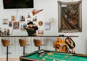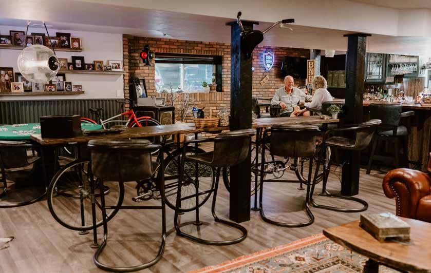 Bicycling is a large part of Dan and Leann’s life, so it is fitting that the decor incorporates them. Leann employed her nephew to build tables out of authentic vintage bicycles that had traveled all over the place with her. “Now they have their forever home,” she said, referring to the cycles, her favorite piece in the space. They also incorporated a vintage safe, a turntable and vinyl collection, and fishing paraphernalia. “It’s a lot of nostalgia, and the culmination of all the things that both Dan and I enjoy.” Whether it’s entertaining friends and family, or relaxing with their dog Winner, Dan and Leann enjoy making memories in their basement bar.