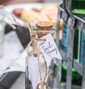 Glass Bottles labeled “Let’s Sail Away.” Inside, roll up a handwritten note, joke or riddle for guests to enjoy a chuckle or conversation starter.