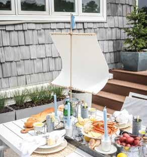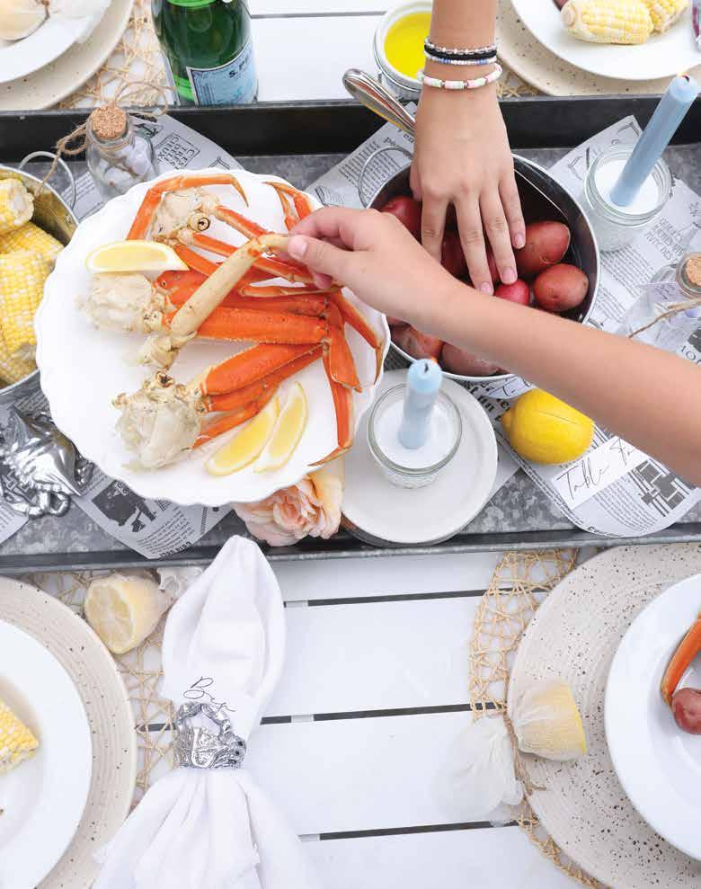 I love family-style meals such as a crab boil this time of year. The food is the star of the show and a vital part of the tablescape – decor optional! Additional elements included here are a large paper-sail, light blue taper candles, a few large flowers, and heavy white rope as nautical accents. You can also use other elements such as large seashells, coral or seaglass. Use whatever you have on hand that nods to the sea.