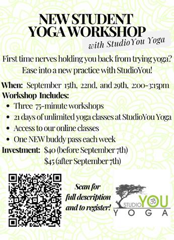 Enjoy three 75-minute sessions at the studio, 21 Days Unlimited Yoga at Studio You, and a new buddy pass to give to a friend each week. This series will include discussion and instruction on alignment, modifications, studio etiquette and what to expect during a class. Full details and registration at: StudioYouYoga. com/workshop-events . Class fee is $40 before Sept. 7; $45 after.