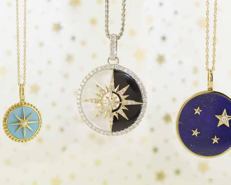 Celestial-themed jewelry, layered necklaces or chains, huggie hoop earrings and matching wedding bands are popular this year. However, pearls never go out of style and the chic, modern ones are fabulous, affirms Adam McGee, owner of McGee & Company Fine Jewelers in Greenwood.
