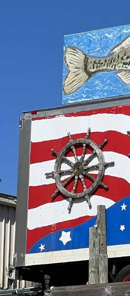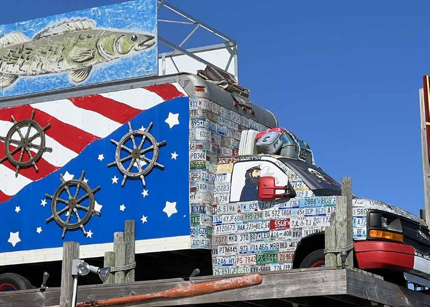 at local auctions, such as the lighthouse and bench out front. There’s even a fish with a pipe in its mouth.