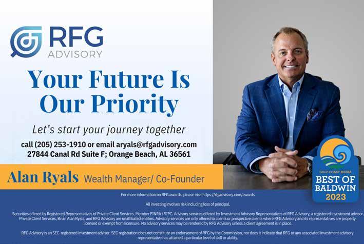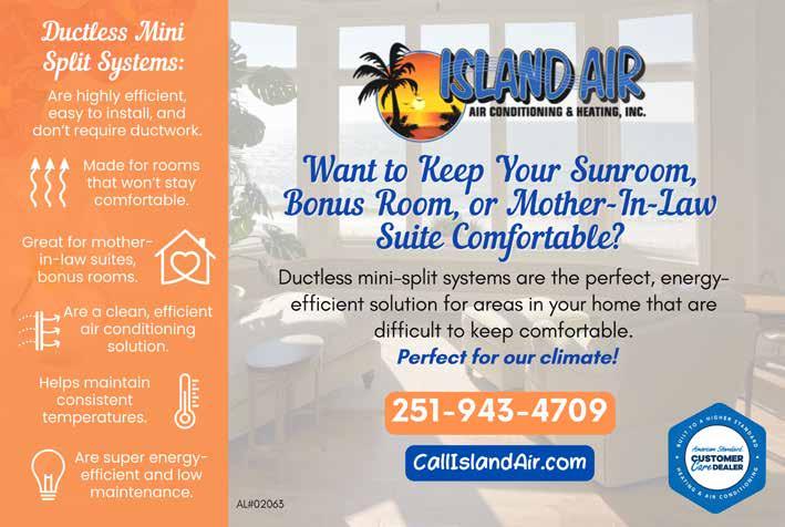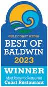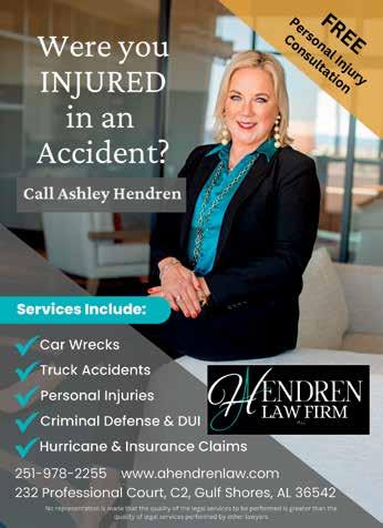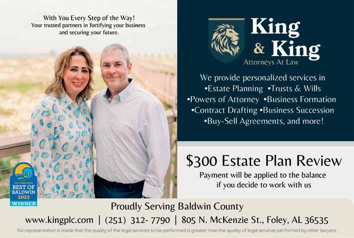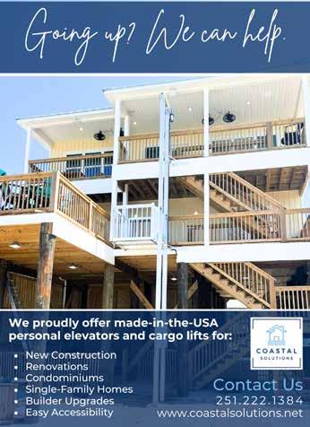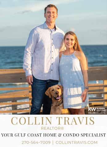 A Dreamy Date Night IS ALWAYS IN SEASON Panoramic Gulf Views Indoor & Outdoor Seating As the busy hum of peak season fades, treat yourself to a taste of romance bathed in dreamy gulf-front sunsets and mouthwatering epicurean delights. With award-winning Chef John Hamme at the helm, your hearts (and your hunger) will be in good hands. 251-224-3600 925 Beach Club Trail Gulf Shores, AL DineAtCoast.com Locally Sourced Provisions Online Reservations Available Generators in stock now in Orange Beach. Titanium Dealer Sales. Installation. Service. KEEP YOUR POWER ON, EVEN WHEN THE POWER IS OUT. Whenever there’s an outage, KOHLER® generators keep your lights on, your fridge cold and your house cozy. And they can power your entire home.* No matter the weather, we’re with you. (860) 467-6466 www.thepowerisout.com SALES - SERVICE - INSTALLATION POPULAR MODELS IN STOCK! *when sized and installed properly. A Division of Streamline Electric, LLC . Marlborough, CT Since 2006 . ELC-192668-E1 Call (251) 981-6431 advancedmarineandpower.kohlergeneratordealer.com 25286 Canal Road Orange Beach, AL 36561 Hurricane Prep Starts Now Financing available, call today 2023 Hurricane Season: June 1st - November 30th 12