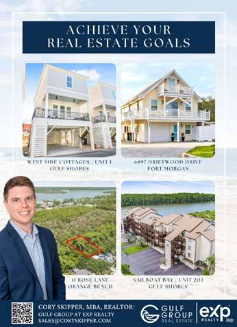 BUILDING DREAM POOLS FOR OVER 65 YEARS COX POOLS IS LOCAL, FAMILY-OWNED AND OPERATED, AND YOUR PREMIER CHOICE FOR LUXURY POOLS. COXPOOLSSE.COM | 866.711.7665 AL (GA) Lic # 19701 • FL Lic # CPC 1458322 MS Lic # 17175-SC • LA Lic # 51181 Here For All of Your Coastal Real Estate Needs Collin Travis Keller Williams Alabama Gulf Coast 270-564-7009 | coastalrealty.co 28888 CANAL ROAD | ORANGE BEACH, AL 36561 251.923.3400 info@heritageorangebeach.com heritageorangebeach.com b The Gulf Coast’s Premier Luxury Motor Coach Resort And Marina 28