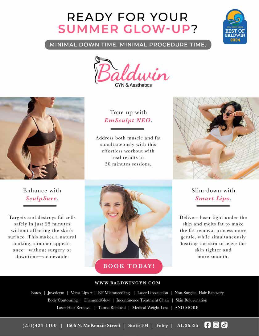 COME REDISCOVER EMPORIUM@C! With a unique blend of style and beachy chic it’s the go-to place to shop for coastal gifts & more! Find the perfect mix of apparel, accessories, gifts & decor! LOCALS DISCOUNT 10% OFF regular-priced items Stop in or shop online today we can’t wait to see you! WWW.EMPORIUMATC.COM | 251.981.8444 25405 PERDIDO BEACH BLVD, SUITE 11, ORANGE BEACH, ALABAMA 36561 B @EMPORIUMORANGEBEACH | V EMPORIUMATC_OB Dr. Lauren Lee Is A Top Invisalign Provider In Alabama. orangebeachfamilydentistry.com | 251.321.7575 25299 Canal Road, Suite A-5, Orange Beach Whether you come in for a cleaning or major work, our mission is to make your experience a positive one. In addition to restorative dentistry, we also offer teeth whitening and botox or filler injections. Trust Your Smile To Someone With Experience. Termite Inspection | Termite Bonding | Pest Control 844-MRBUGGS | www.mrbuggs.com We Know What BUGGS You 29 MAY 2024 | CITYLIFESTYLE.COM/GULFCOAST