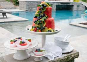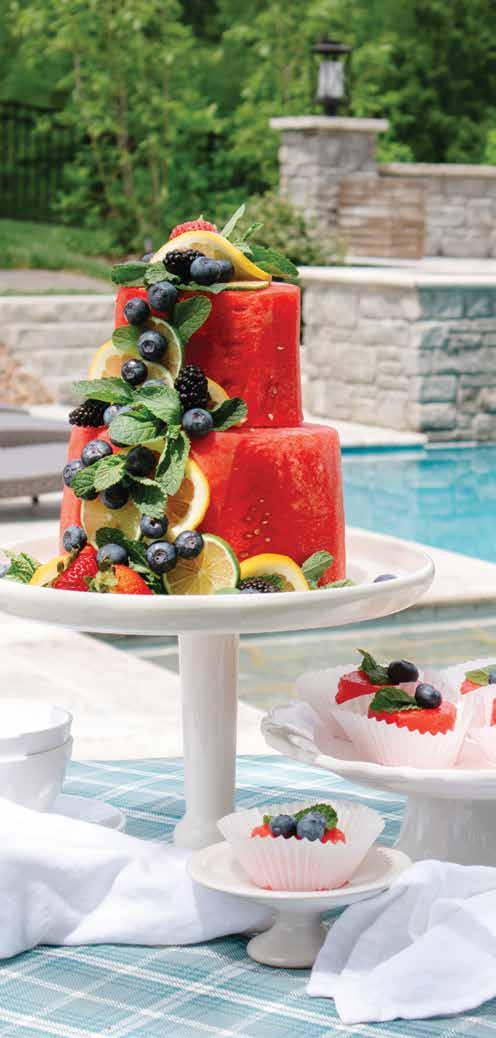 1. Prep both watermelons by cutting off the rinds and sculpting to create a cylinder shape with a flat top and bottom. Make the bottom cylinder bigger and the top cylinder slightly smaller.