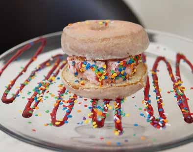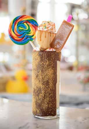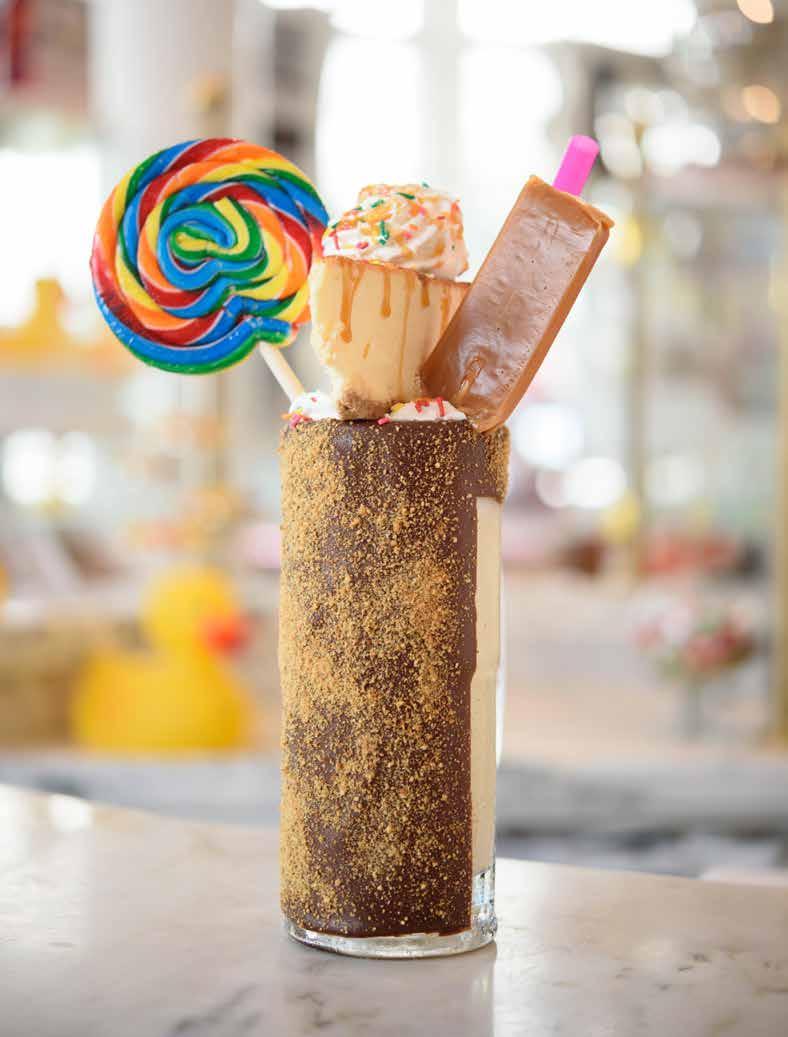 To kickstart your meal experience, indulge in one of Sugar Factory’s signature smoky candy goblets. These whimsical creations emit a magical smoke as they are served and come complete with fullsize gummy candies in the shapes of sharks, rings, cherries, and more. For the adults in the group, the bar offers a wide variety of flashy goblets and other cocktails that perfectly complement the theme. From The Lollipop Passion to the Royal Raspberry Mimosa (you can even make it a mimosa flight with two other flavors) to the Cotton Candy Cosmopolitan, the drink options are as captivating as they are sugary and delicious.
