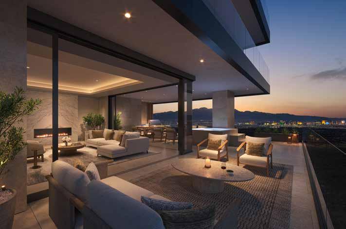 The contemporary residences range from 2,279 to 8,349 square feet of interior space, complemented by expansive exterior spaces ranging from 627 to 3,555 square feet. They are designed to seamlessly blend indoor and outdoor living, offering thoughtfully designed features and touchpoints. Residents will enjoy outdoor dining and grill areas, the convenience of semi-private elevators, private garages, and fully furnished interiors that boast epicurean kitchens and spa-inspired bathrooms. The sweeping cinematic views of the Spring Mountain Range and the Las Vegas Strip will take your breath away.