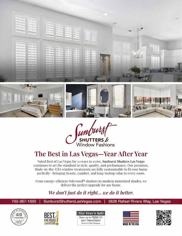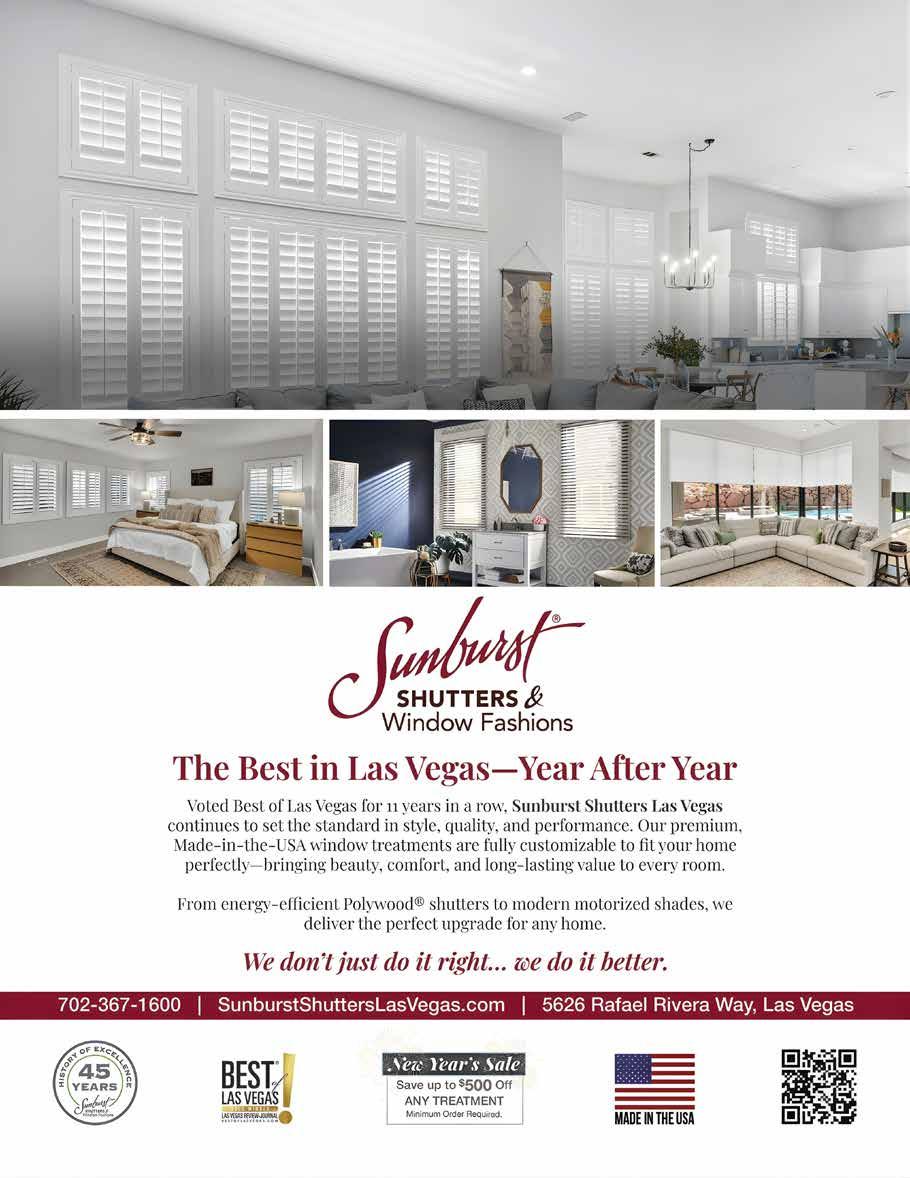 “Custom shutters give homeowners unmatched control over light and privacy while enhancing the overall look of their space,” says Darik Nielson, general manager of Sunburst Shutters & Window Fashions (sunburstshutterslasvegas.com), a Las Vegasbased company widely known for transforming homes with precision-crafted window treatments. “Adjustable louvers allow you to fine-tune sunlight throughout the day without sacrificing privacy.”