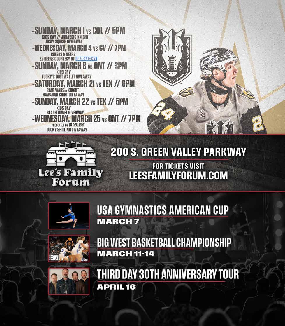 May the force be with you at our out-ofthis-world Star Wars Night! Dress as your favorite characters, enjoy epic themed activities, and cheer on the Henderson Silver Knights as they battle on the ice. Special giveaways, limited-edition merchandise, and interactive fan experiences await Jedi, Sith, and Star Wars fans of all ages. leesfamilyforum.com