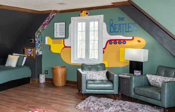 “At Paradise, our guests experience a blend of music history and retreat-style amenities that include themed rooms inspired by legendary artists, gathering areas, fire pits, a pool, spa and a fitness gym,” says Kris. “Two of our more unique social spaces include the Johnny Cash–inspired Whiskey and Cigar Bar and the Rolling Stones pub–style gathering room.”