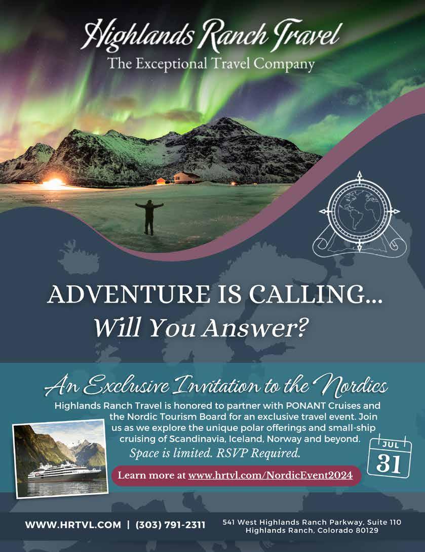 Highlands Ranch Travel is honored to partner with PONANT Cruises and the Nordic Tourism Board for an exclusive travel event. Join us on Wednesday, July 31, from 5:30 pm – 8:00 pm at Maggiano's Little Italy in Englewood as we explore the unique polar offerings and smallship cruising of Scandinavia, Iceland, Norway, and beyond. Space is limited. Please RSVP by 5:00pm Tuesday, July 23 by calling the Highlands Ranch Travel office at (303) 791-2311 or via hrtvl.com/NordicEvent2024