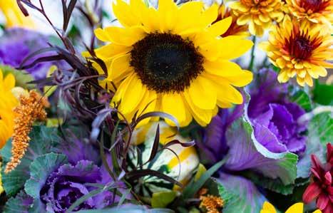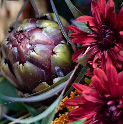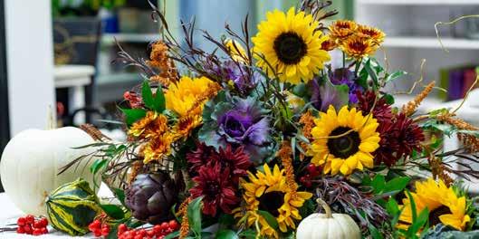 Designer Ellie Golden of Abloom in Highlands Ranch curated this cornucopia using florals as their medium of choice. We see abundant autumn flowers, bright sunflowers, chrysanthemums, upright amaranthus, and mountain ash. Never one to limit themselves, the creative minds at Abloom integrated fresh kale, artichokes, gourds, trendy white pumpkins, and mountain berries.