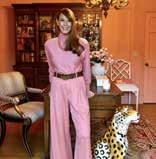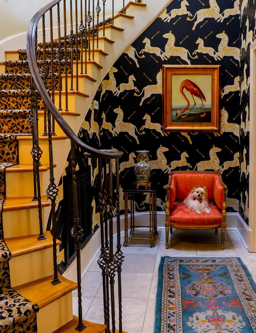 A leopard-print runner up the spiral staircase from the family room blends seamlessly with Scalamandre’s zebras flanking the stairwell, creating another focal point of the home. The runner was actually there before the Baileys moved in as were the arrow light fixtures, similar to the arrows in the zebra wallpaper. A silk upholstered pink chair adds contrast to the black wallpaper with an Audubon pink flamingo print hanging above.