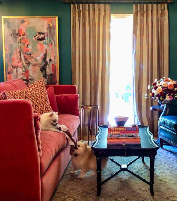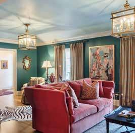 it, I had a feeling that this is home.” She adds, “I had a vision from that first moment of what I wanted it to look like - I saw the Cole&Sons Florencecourt wallpaper, the light blues, the chair railing. And so it was the first room we redecorated. It was amazing to see the progression, every day seeing this vision I had in my mind come to fruition.” The sideboard came with the home while the Baileys brought in their previous dining table and purchased 10 soft blue velvet upholstered chairs. Locust Lane Rugs created a large custom area rug in colors