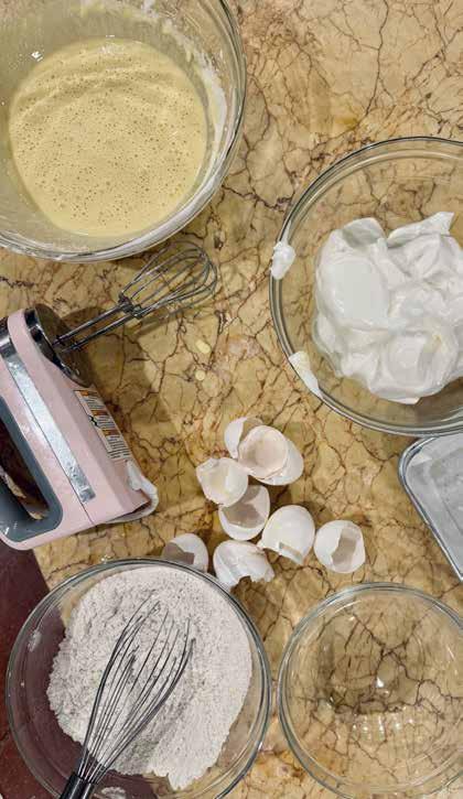 4. Add half of the whipped egg whites into the egg yolk mixture. Beat on low speed for 10 seconds. Repeat with remaining egg whites and beat on low for 10 seconds. Add half of the flour mixture and beat on low or fold with a silicone spatula until combined. Repeat with remaining flour mixture. Avoid over-mixing and deflating those egg whites. Batter will be very light.