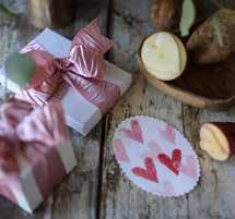 1. Cut the potato in half. Using a small knife, carefully carve a heart shape onto the flat side of the potato. Carve freestyle or use the free template under “DIY Stationery” on the blog at silvertoothhome.com/ blog/diy-stationery. Even when using the template, each carving will come out as unique art like the ones you see here.