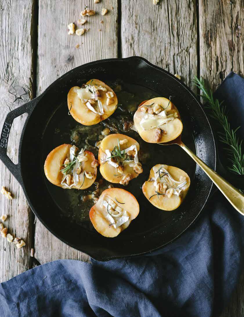 Preheat oven to 400 degrees. Slice apples in half and remove the core. Set aside. Heat skillet and melt butter. Add brown sugar and lightly stir. Place apples face down in the skillet and add apple juice and a sprig of rosemary. Allow apples to cook on stovetop for 5-10 minutes. Flip apples over and top with Brie, chopped walnuts and chopped rosemary. Bake for 6-7 minutes or until the Brie is melted. This is best served warm and is easy to reheat. Enjoy!