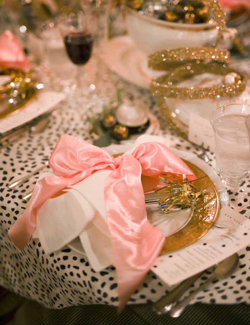 One of their favorite touches is something simple yet stunning: the napkin bows. “We love bows,” Mary Carol admits. “We used wide satin ribbon for our napkin rings, which is so easy to do but has such a wow factor. It says, ‘Let’s celebrate!’ without taking hours to prepare.” Each setting also includes a cheerful party horn, a whimsical nod to the midnight toast to come.