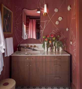 Particular Tile in Satin Terracotta and Vanilla Bean, Arté Wallcovering Shards in Brick Red, Red travertine sink, Rachel Donath chunky mirror, Playful art work by Olivia Fields