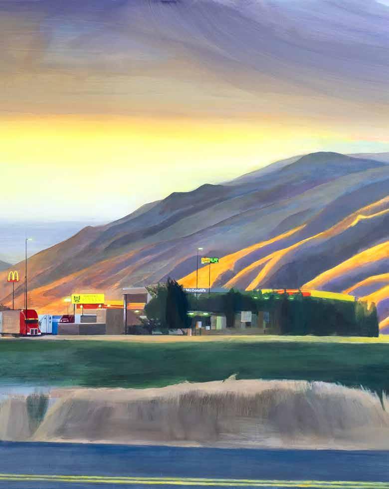 “The signature of my work is that I like to include those things that we might not usually consider as subjects for a painting,” Madeline says. “The gas station, the rest stop, the highways and roads built in and around the mountains… it’s about embracing the humor and structures of modern life in contrast with the beautiful landscape we live in daily in the West."