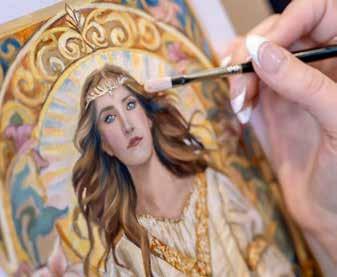 In recent work, she’s gravitated toward painting women as divine goddesses. “So much of our society is male-centered,” she explains. “I wanted to create more female representation—something for my daughters to be represented by and to aspire to.”