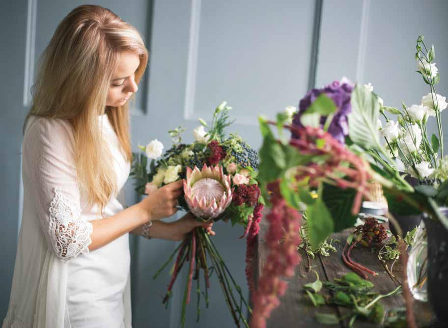 Step 2: Now it’s arranging time — think focal and filler. The best way to start the arranging process is by choosing your most interesting or favorite flowers — this will be your focal point. Hold the focal flower(s) upright and add your supporting blooms around it. Make sure to turn the bouquet as you build so that the design is as desired. Once this is complete, add your filler flowers to finalize the look. Filler options include baby’s breath, ivy, fern, eucalyptus and more.