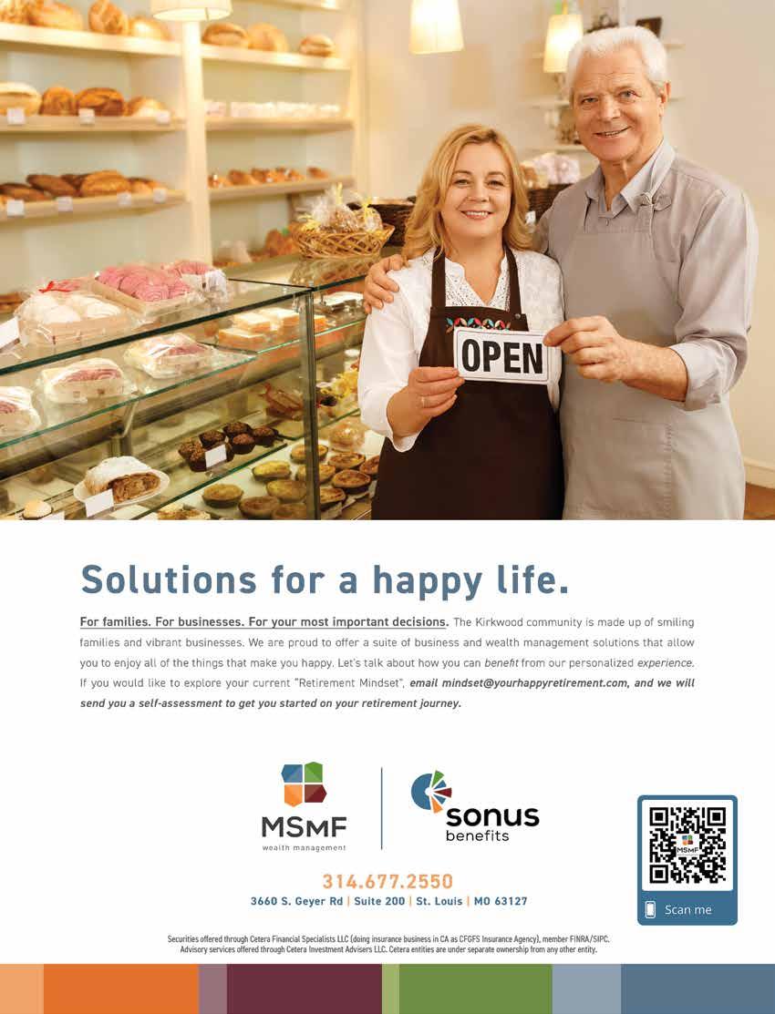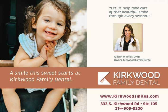 Learn how to start your own publication at: citylifestyle.com/franchise CITYLIFESTYLE.COM/KIRKWOOD | Kirkwood City Lifestyle™ is published monthly by Lifestyle Publications LLC. It is distributed via the US Postal Service to some of the Kirkwood area’s most affluent neighborhoods. Articles and advertisements do not necessarily reflect Lifestyle Publications’ opinions. No portion of this magazine may be reproduced in any form without written consent. Lifestyle Publications does not assume responsibility for statements made by advertisers or editorial contributors. Information in Kirkwood City Lifestyle™ is gathered from sources considered to be reliable, but the accuracy of all information cannot be guaranteed. 4