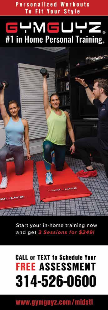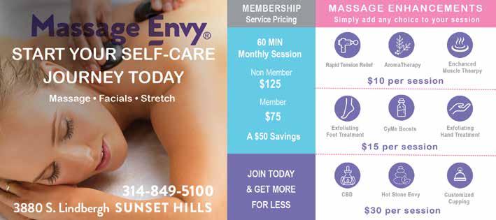 Tables for two? Ease tension and reduce pain with an Aquarius Signature Couple’s Massage in our beautiful, cozy couple’s suite. “Definitely the best in St. Louis” Unwind With That Special Someone Book your appointment today! (All services by appointment only) Spa Services: Mon-Sun 9am-9pm Clayton Plaza West • 7750 Clayton Rd., Suite 103 Richmond Heights, MO 63117 314-645-7643 • aquariuswellness.com Massage • Facials • Waxing Energy Work • Gift Cards 35 | CITYLIFESTYLE.COM/KIRKWOOD SEPTEMBER 2023
