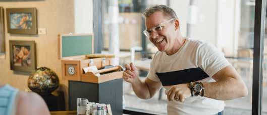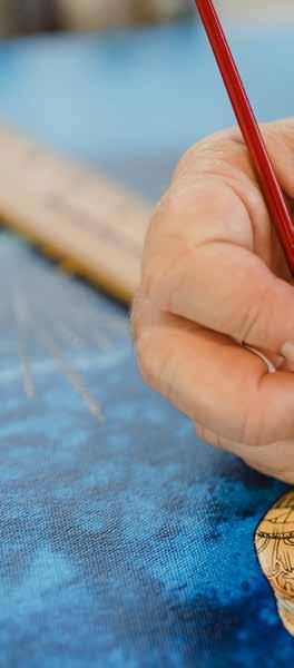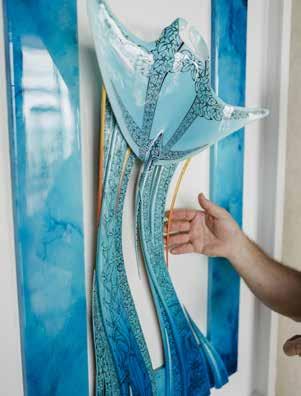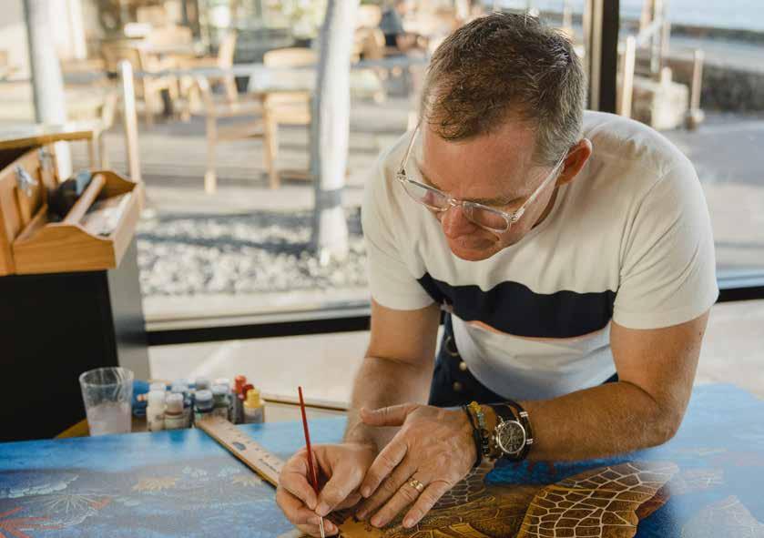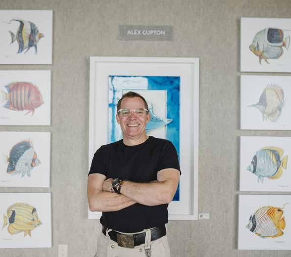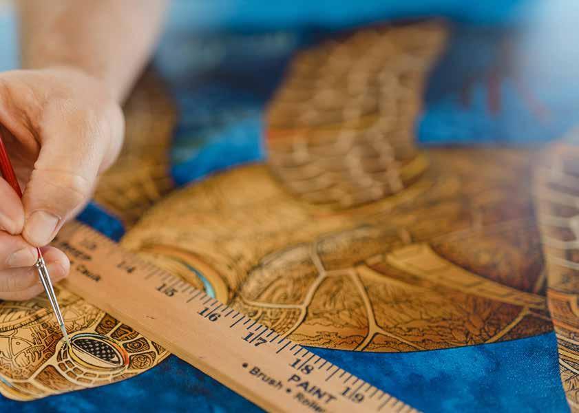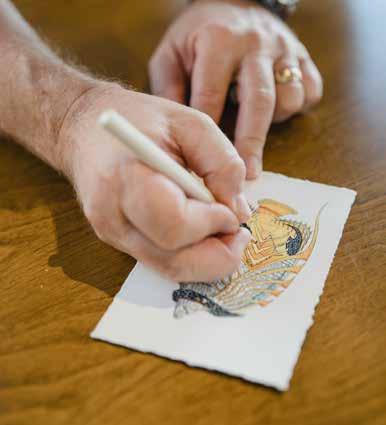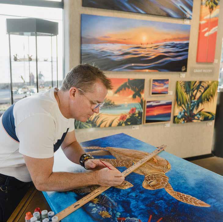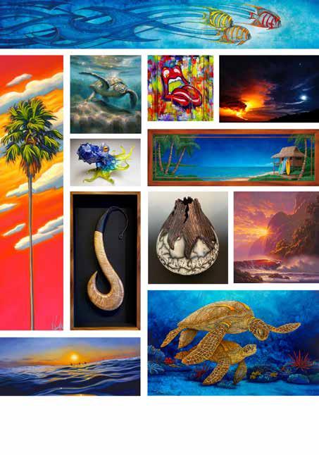 While painting large scale murals for primarily residential clients consumed much of his early years, today he is a master of intricate pen and ink drawings, wood carving to create three-dimensional art, mosaics and bronze sculpture. Much of his work is commissioned by clients worldwide (currently he is booked out for a year!) however, his work may be found in galleries throughout Hawaii and Las Vegas, including a colorful, inviting space he opened together with his wife Jacqueline and partners Victor and Stephan Pilolla in 2021. His work is featured in the attractive Gupton Gallery along with 23 additional artists, representing a total of 17 Hawaiibased artists and a handful from Oregon, Washington and Ohio.