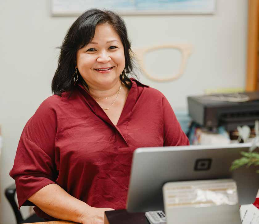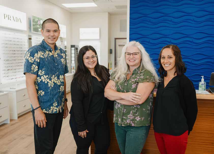 Yet, despite the success and momentum of her mainland career, Hawaiʻi was always the endpoint. In 2016, Darcy returned home and purchased Eyewear Kona from longtime local optician Alvin Fujimoto, continuing a legacy of quality and trust that the community already knew well. Her own family history in the islands dates back to 1886, when her Portuguese ancestors immigrated to Hawaiʻi, and that sense of rootedness shapes how she approaches business. Eyewear Kona, for Darcy, is not about chasing trends— it’s about stewardship, giving back and doing things the right way.