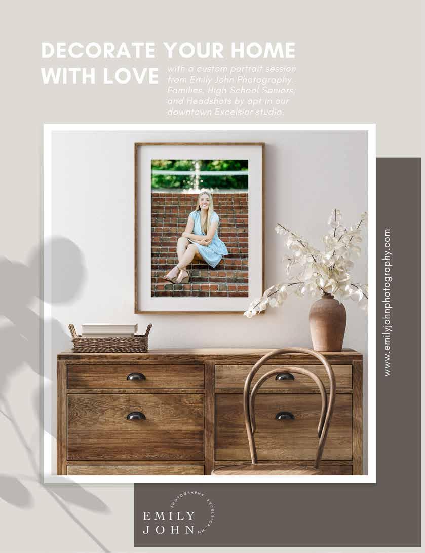 Does the thought of standing in front of a camera make you nervous? Don't worry, I've got you. No matter your age, size, shape, or how uncomfortable you might feel about it, I will help you shine. Each photography session with me is a collaborative, creative project where you will feel comfortable and confident being yourself and have fun! Now booking Headshots, Families, and High School Seniors for summer/fall 2023. Visit www. emilyjohnphotography.com or email hello@emilyjohnphotography.