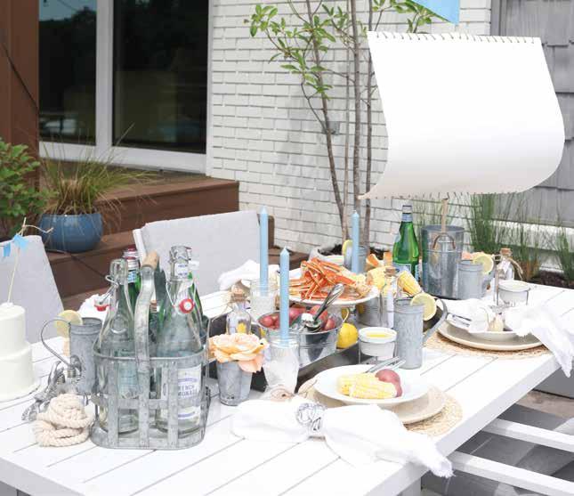I love family-style meals such as a crab boil this time of year. The food is the star of the show and a vital part of the tablescape – decor optional! Additional elements included here are a large paper-sail, light blue taper candles, a few large flowers, and heavy white rope as nautical accents. You can also use other elements such as large seashells, coral or seaglass. Use whatever you have on hand that nods to the sea.