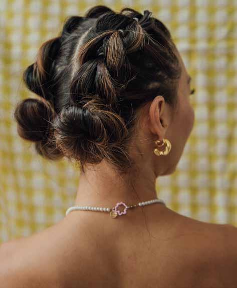 Part hair down the center. Create pullthrough braids on each side of the head. Tie elastic at the end of the braids to create a ponytail at the nape of the neck. For extra volume in the buns, tease the hair in the ponytail before twisting it into a bun. Secure with hair pins and... Voilà!