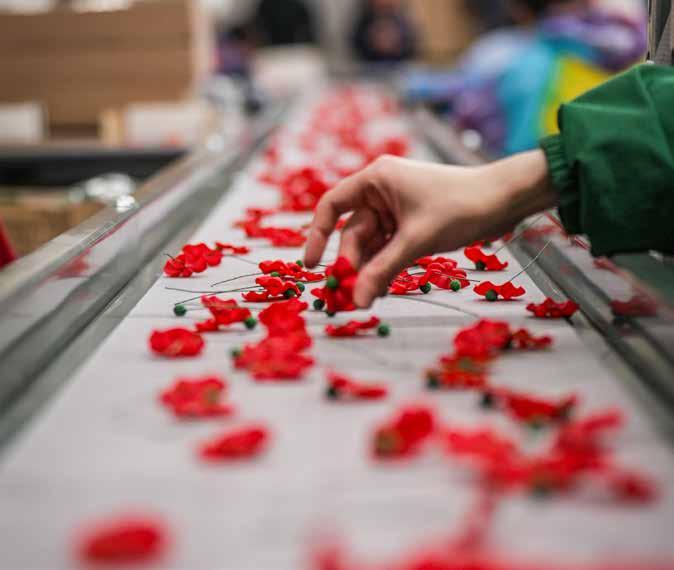 A conveyor belt full of red fabric poppies assembled for Veterans of Foreign Wars (VFW) for distribution