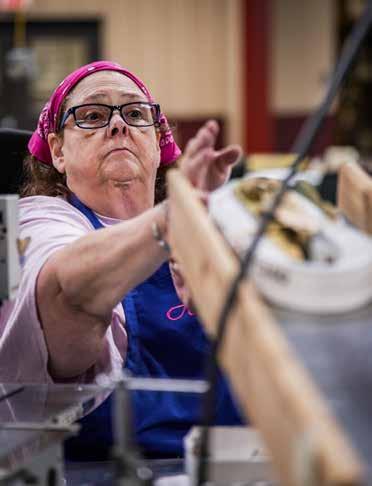 Also in production that day are parts for pumps used by municipal water systems and plastic cups covered with comic characters being packaged for sale at party stores. Another area is set up to sew boots for McFarlane Aviation Products.