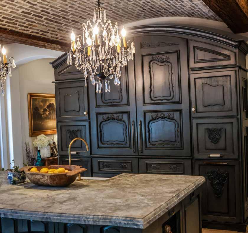 “18th century credenzas were purchased and dismantled to be used for the facing of the kitchen cabinets and various other areas throughout the house. The wine credenzas were built with antique furniture that was dismantled and we used wine boxes for the drawers.”
