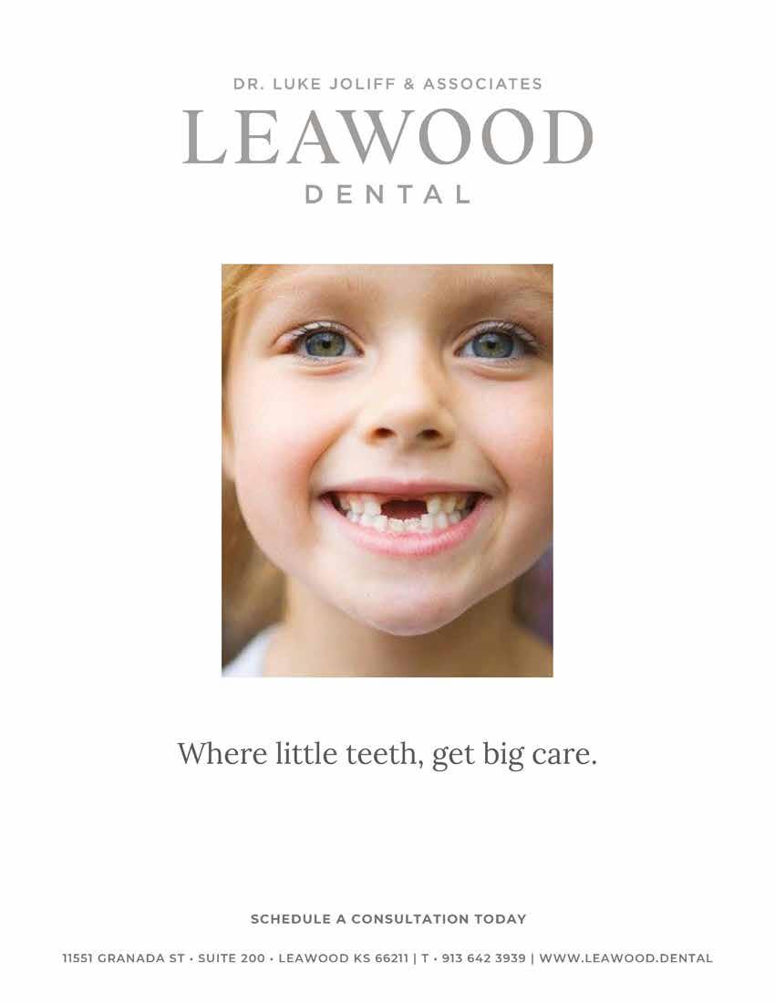 Leawood Dental has 17 employees, including three dentists—Dr. Luke Joliff, Dr. Meghan Hamilton and Dr. Nick Mehlin. All doctors have a “diverse skill set and extensive experience” in treating patients of all ages and health. “All six full-time hygienists have the highest training and are very experienced with both pediatric and adult patients,” Dr. Joliff adds.