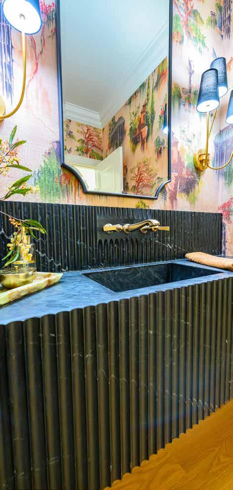 If there’s one place Manz encourages clients to take risks, it’s the powder room. Here, she leaned into terracotta earth tones, layering textures and tile sizes for visual interest and warmth. Patterned and solid tiles work together, while textured wall coverings and a sculptural stone sink elevate the space from functional to delightful.