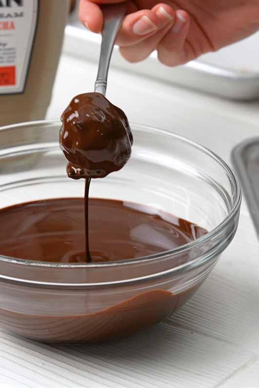 5. Using a fork, dip chilled truffles into melted chocolate, coating at least twice.