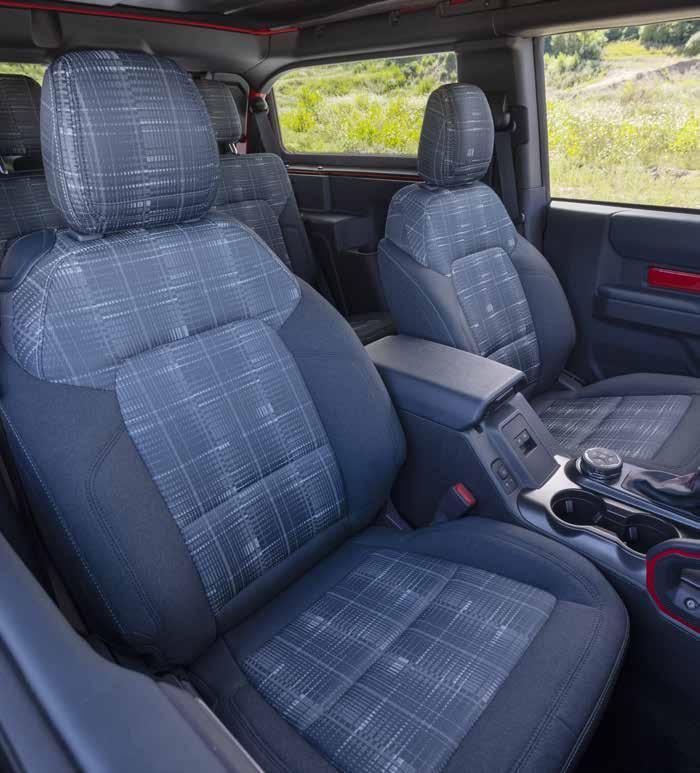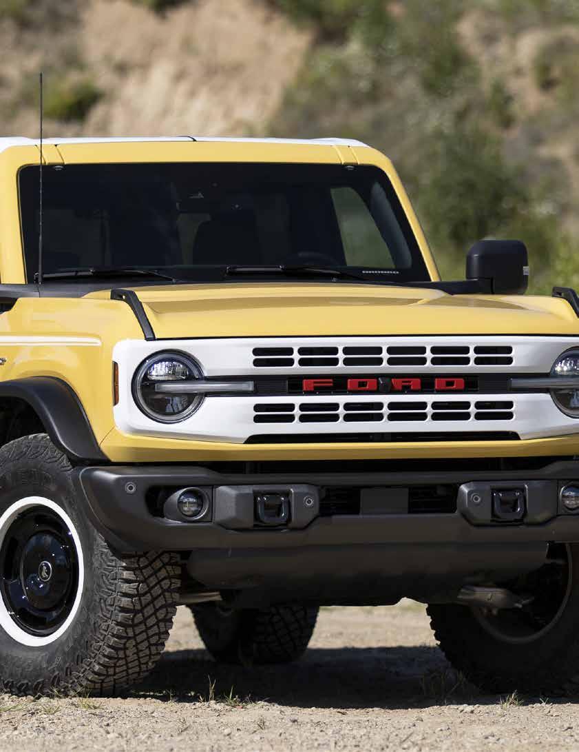 Step into the Ford Bronco and immerse yourself in an array of stylish interior options, including plaid cloth, marine-grade vinyl, and leather-trimmed vinyl with perforated plaid inserts. Exterior choices are equally striking, featuring custom colors like Eruption Green Metallic, Hot Pepper Red Metallic Tinted Clearcoat, and the eye-catching Yellowstone. With nine distinct trim options, your Bronco can reflect your unique personality and taste.
