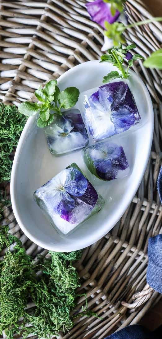 ***Floral Ice cubes: use a silicone ice cube tray, pansies, mint and boiled then cooled water (boiling the water is the key to produce clear vs cloudy cubes). Fill an ice cube tray with pansies and mint leaves, fill halfway with water and freeze. Once frozen, remove the tray from the freezer and fill cubes the remainder of the way with water. Freeze completely before use.