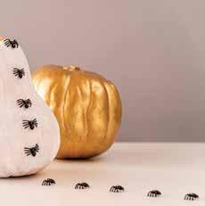 Paint your “background” pumpkins in metallic colors. For your centerpiece, use white paint to cover the body, metallic paint for the stem and hot glue your creepy crawlers all around.