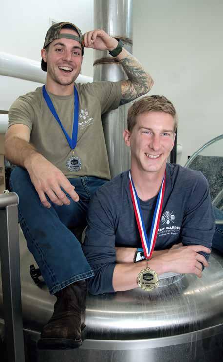 behind Lost Barrel. The Double IPA is Dan’s “baby,” so he explains: “It’s named for the two kinds of hops it contains, Strata and Azacca, both tropical tasting hops. It’s a higher ABV beer, sitting at around 9% alcohol, but we offset the bitterness and made it a lot more sweet, about 10 IBU (international bitterness units). It doesn’t taste like a double so it’s very deceiving.”