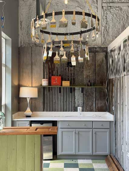 Left page, top: Kids at Mobile Hope help run the thrift store. | Middle: Find anything and everything at Mobile Hope’s thrift store, to help support the mission of assisting unhoused youth. | Bottom: The doors at Graffiti & Silk represent the kids who don’t have doors to walk through if they’re living on the streets. | This page: A chandelier created with paintbrushes
